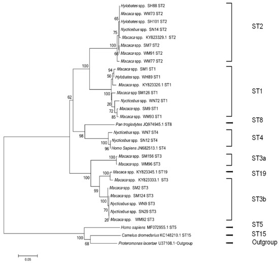 To date, 32 subtypes of Blastocystis have been proposed based on SSU rRNA gene sequencing [30]. However, only 28 subtypes (ST1–ST17, ST21, and ST23–ST32) are accepted due to their unabridged sequence data and meeting the current criteria for unique subtype designations. ST1–ST4 are the predominant STs, suggesting zoonotic potential [31]. ST1–ST9 and ST12 often appear in human Blastocystis-like infection cases [32]. Other subtypes are only found in specific animals, indicating a certain degree of recessive host specificity [1,31]. For example, hoofed animals, such as pigs, are the natural hosts of ST5 [10]. ST4 is the most common subtype in rodents [32], while ST6 and ST7 are common in birds [33]. Previous studies suggest that the most common subtypes in NHPs are ST1, ST2, ST3, and, especially, ST2 [34,35] (Table 1).