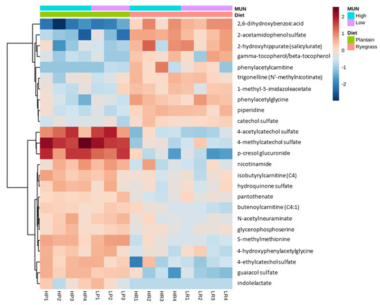 Heatmap of the top 25 metabolites detected in cows milk clustered by a Wards clustering algorithm that are considered statistically different (p < 0.05) based on a linear model where diet (plantain or ryegrass) was considered the primary factor and animal genetics (milk urea nitrogen breeding values) was considered a covariate. A red colour indicates a higher abundance of the corresponding metabolite and a blue colour indicates a lower abundance of the corresponding metabolite.
