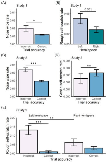Mean rates per trial per second of (A) nose wiping in Study 1 in function of trial accuracy; (B) rough self-scratching in Study 1 in function of hemispace; (C) nose wiping in Study 2 in function if trial accuracy; (D) gentle self-scratching in Study 2 in function of trial accuracy; and (E) rough self-scratching in Study 2 in function of trial accuracy and hemispace *** p < 0.001; ** p < 0.01; * p < 0.05.