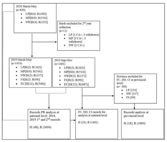 29]. The current research acknowledges these gaps and attempts to study current breeding practices by evaluating multiple performance indicators from on-farm animal records at an extended geographic area to broaden information within the SA smallholder farms. The research aims at assessing reproductive performance as defined by pregnancy rate (PR), fetal and calf losses (FC), calving interval (CI) and days open (DO) on beef cattle farms to set benchmarks for herd reproductive performance. Furthermore, the study aims to assess whether management practices have an impact on levels of performance. Setting benchmarks for these performance indicators will provide guidelines for the establishment of developmental goals and extension advisory services toward an improved and efficient on-farm breeding system in smallholder farms.