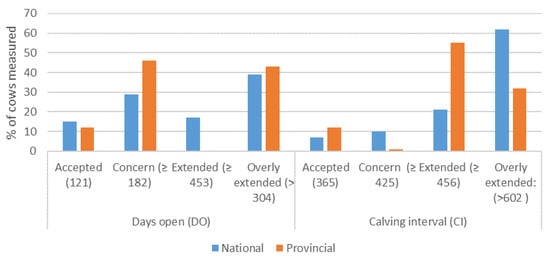 48]. This is in agreement with the targeted level derived for smallholder farms in this study. However, 75% of the herds in the current study obtained extended CI and DO (608 and 334 days), respectively, as achievable levels. This indicates that re-conception is potentially one of the major areas that require significant management interventions. The extended CI and DO highlight that farmers are either not aware of the cost to infertility or may not have the necessary skills and knowledge to manage it. Shortening these periods through better management can be beneficial on production and subsequently increase herd profit [
