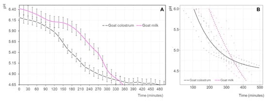 (A) Evolution of the pH (mean values ± standard deviation) of the goat milk (pink line) and goat colostrum (black line) inoculated with yogurt starter cultures during fermentation. (B) Non-linear mixed regression model of yogurt acidification (pH) predicted for goat milk (dashed pink line; triangle: raw data) and goat colostrum (black line; circles: raw data). The induction period was removed for the fermentation of milk and colostrum in the modeling of the data.