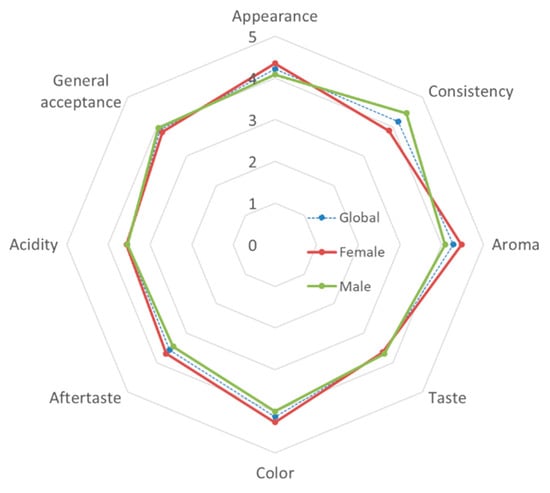 In general, the panelists showed an average overall acceptance close to 4 points (3.89), with acidity being the sensory attribute that received the lowest score (3.55) and aroma the highest (4.27). By gender, men found a significantly more pleasant consistency than women did (p = 0.035), while women gave better scores for taste, although the differences did not become statistically significant (p = 0.091).