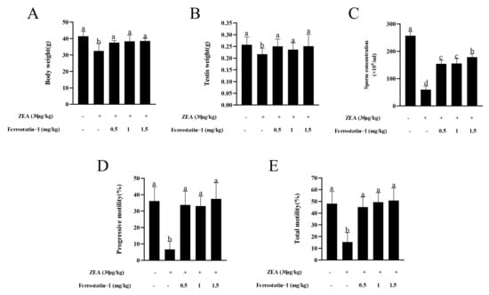 ZEA induced a reduction of body weight, testis weight, sperm concentration, and sperm motility in mice that was alleviated by administration of Fer-1. (A) Body weight of all groups of mice is presented as a bar graph. (B) Testis weight of all groups of mice is presented as a bar graph. (C) Epididymal sperm concentrations in experimental mice are presented as a bar graph. (D) Epididymal progressive sperm motility in experimental mice is presented as a bar graph. (E) Epididymal total sperm motility in mice is presented as a bar graph. The data are expressed as means ± SEM, with n > 6 per group; a, b, c, d means not sharing a common superscript are different (p < 0.05).
