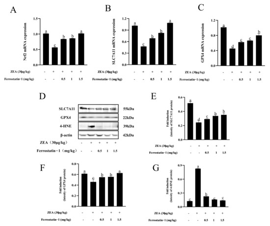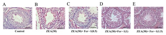 In this study, the effect of ZEA on spermatogenesis and changes in antioxidant indexes in male mice were explored. At the same time, the relative contents of Fe2+ and Fe3+ as well as changes in Nrf2, SLC7A11, and GPX4 expression levels were detected in mouse testes when ferrostatin-1 (Fer-1) was administered with ZEA. Likewise, the correlation between ferroptosis and ZEA-induced male reproductive injury was further demonstrated.