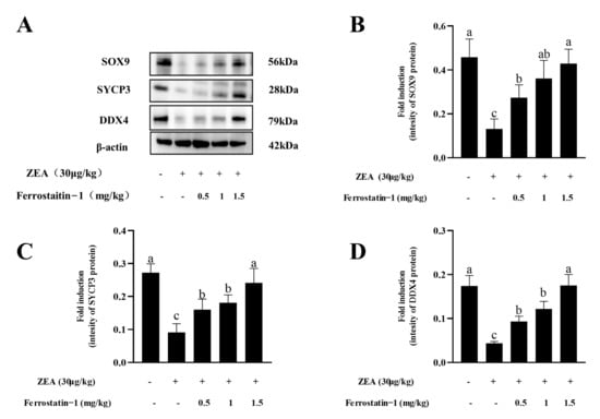 SYCP3, DDX4 and SOX9 are markers of spermatocytes, male germ cells and Sertoli cells, respectively. It was observed that the ZEA treatment significantly decreased the levels of SYCP3, DDX4 and SOX9 proteins in the testis, while the levels of those proteins were increased by the treatment with the ferroptosis inhibitor Fer-1 from 0.5 mg/kg to 1.5 mg/kg (Figure 3A–D, Supplementary Figure S2).