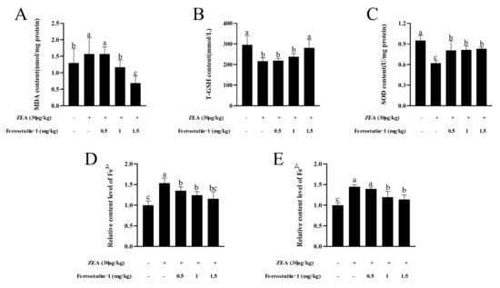 fTo determine whether ZEA exposure causes a change in the oxidation index of testicular tissue, the content of malondialdehyde (MDA) in the testis was examined. Results showed that ZEA exposure significantly increased MDA content in the testis (p < 0.05). Meanwhile, the contents of T-GSH and SOD activity in ZEA treatment group were fewer than those in the control group (p < 0.05) (Figure 4A–C). After Fer-1 treatment, the MDA, and T-GSH contents and SOD activity increased gradually with increasing Fer-1 concentrations, and the rescue effect of Fer-1 was more obvious at a concentration of 1.5 mg/kg (p < 0.05) (Figure 4A–C). As shown in Figure 4D,E, the relative levels of Fe3+ and Fe2+ in ZEA treatment group were higher than those in the control group (p < 0.05). After the injection of Fer-1, the level of the elements was reduced (p < 0.05).