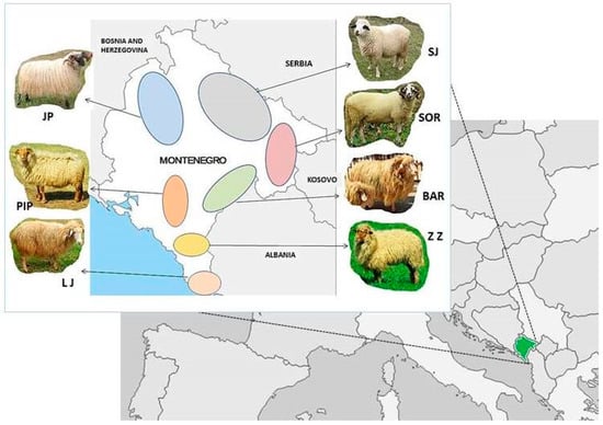 Seven sheep populations reared in different geographic regions and climate conditions of Montenegro were used in the present study (Figure 1). Animals are selected according to their typical morphological breed characteristics described by references [21,22,23].