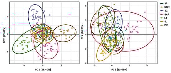 Principal component analysis (PCA) revealed some differentiation between breeds ZZ, LJ, BAR, PIP (PC1, PC2), and SJ (PC3, PC4), but with some overlap among all seven breeds (Figure 2).