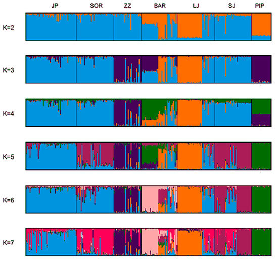Structural analysis revealed the existence of two pools of breeds. The first consisted of JP, SOR, BAR, and SJ with a high degree of admixing, and the second was composed of three geographically isolated breeds with a small population (ZZ, LJ, PIP).
