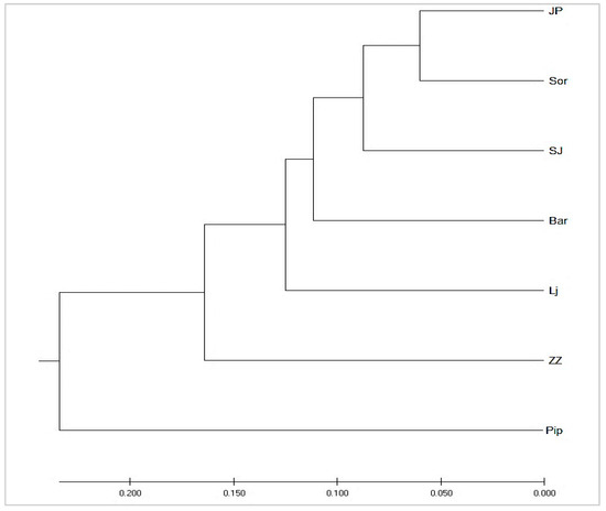 The dendrogram of the studied sheep breeds (Figure 4) constructed on the basis of Nei’s standard genetic distance shows that JP and SOR were genetically close and belong to the same cluster; the nearest sub-cluster was SJ. Although separated, BAR and LJ were also quite close, and PIP and ZZ had the greatest genetic distances from the other breeds.