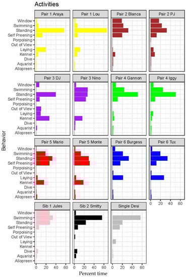 The following supporting information can be downloaded at: https://www.mdpi.com/article/10.3390/ani12213031/s1, Table S1: Results of Dunn’s post-hoc tests for activity budgets; Table S2: Results of Dunn’s post-hoc tests for proximity; Figure S1: Heat maps of “Blue Pair”; Figure S2: Heat maps of “Red Pair”; Figure S3: Heat maps of “Green Pair”; Figure S4: Heat maps of “Brown Pair”; Figure S5: Heat maps of siblings; Figure S6: Heat map of unpaired male.