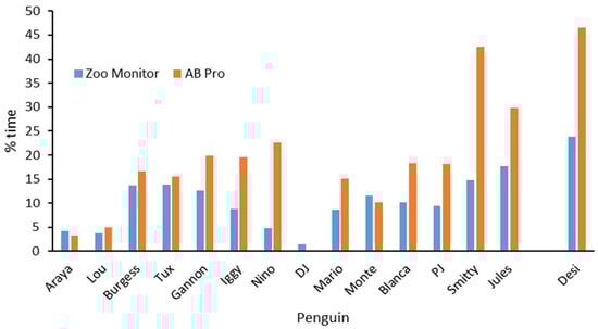 To calculate the amount of time birds spent in the water using the different data collection systems, we used the percent time in which individuals were scored as “swimming” from Animal Behaviour Pro, and the percent of scans in which penguins were identified as being in the water using Zoo Monitor. The amount of time birds spent in the water differed between the two data collection applications. (Figure 3). Penguins were measured as spending significantly more time in the water using Animal Behaviour Pro than Zoo Monitor (t = 3.79, df = 14, p < 0.002). Approximately 2/3 of the Animal Behaviour Pro data were collected outside of the breeding season, while approximately half of the Zoo Monitor data were collected during the breeding season. Similar to the Animal Behaviour Pro activity budget patterns, “Desi” and “Smitty” (along with “Jules”, the other juvenile) spent notably more time in the water than did other birds.