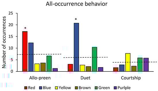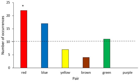 Frequency of allo-preening over 19 observation days based on Animal Behaviour Pro data. Red pair allo-preened significantly more than all other pairs, and Purple pair did not allopreen at all. Dashed line equals the expected frequency of allo-preening if there were no differences amongst pairs; * = p < 0.05.