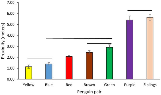 Intra-pair proximity amongst penguin pairs based on Zoo Monitor data. Lines indicate pairs that did not differ significantly from one another. Any bars not connected by lines are significantly different (p < 0.05). See supplemental materials for details statistical output.