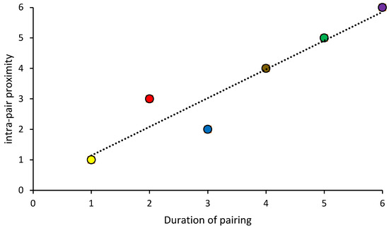 Relationships between duration of pairing and intra-pair proximity based on Zoo Monitor data. For duration of pairing, 1 = together the longest, 6 = most recently established pair. The longer pairs have been together, the more time they spend with one another (Spearman Rho rank correlation, 0.94).