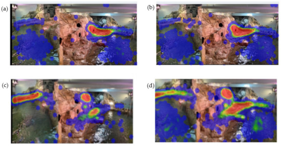 Heat maps generated by Zoo Monitor. Red indicates areas in which individuals spent the most time, and blue the least time. Upper panels: Yellow pair (female “Araya” (a) on the left, male “Lou” (b) on the right). Lower panels: Purple pair (Female “DJ” (c) on the left, male “Niño” (d) on the right), Heat maps for all remaining penguins are available in the supplemental material (Figures S1–S6).