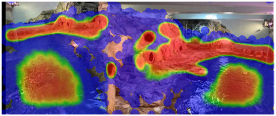 Zoo Monitor-generated heat maps confirm the patterns above. The heat maps show where the penguins spent the most time. The red highlights areas in which an individual spent the most amount of time, while the blue areas are used the least. The distance data suggest that “Araya” and “Lou” (Pair 1—Yellow Pair) spent the most time together, with their average distance apart being 1.2 m. “DJ” and “Niño” (Pair 3, or Purple Pair—the most recently- established pair) spent the least amount of time together out of all the pairs, with their average distance apart being 5.12 m. Lou and Araya’s heat maps suggest that they spent most of their time in the same areas (a single area of intense use), while DJ and Nino’s heat maps suggest that this pair spent most of their time in different areas based on the several areas of intensive use (Figure 8). A combined heat map for all penguins provides a visual representation of overall exhibit use patterns (Figure 9).