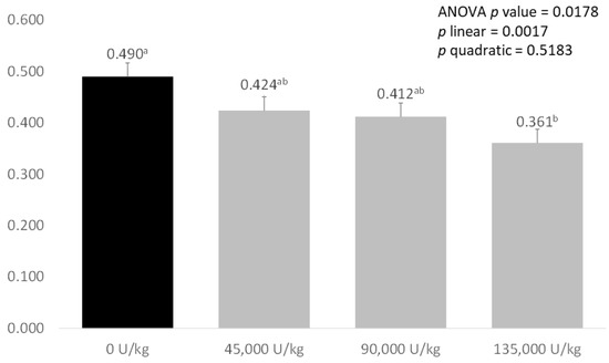 Effect of increasing levels of xylanase addition on ammonia emissions (mg/g) from the faeces of weaned piglets. Values are expressed as means of eight weaned pigs represented from each treatment. Values that significantly differ between treatments (with p < 0.05) are marked with different letter.