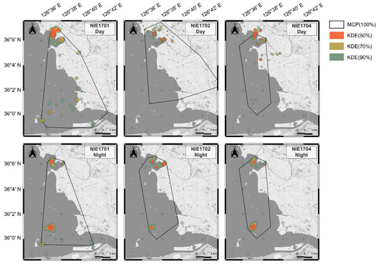 The home range of the three Swan Geese included Yubu Island in the south and Janggu Bay in the north, around the Seocheon Tidal Flat (Figure 2). Each individual had similar home ranges and exhibited no statistically significant difference during the day and night (35.86–76.09 km2 in the day and 31.89–51.77 km2 at night, 100% MCP, Mann–Whitney U test, Z value: 1.0911, p = 0.4; Table 2). The home range calculated by LSCV-KDE was estimated from 0.4–7.06 km2 according to three different percentage levels (50%, 70%, and 90%). The average size of the home range (90% KDE) was 4.1 km2 (range: 2.33–7.06 km2), and the home range (50% KDE) was 0.7 km2 (range: 0.4–1.05 km2) during the day. At night, the average size of the home range (90% KDE) was 3.0 km2 (range: 2.44–3.84 km2), and the home range (50% KDE) was 0.6 km2 (range: 0.47–0.69 km2). NIE1701 exhibited the widest home range day and night compared to the other two individuals. However, the location of the core home range (50% KDE) demonstrated significant differences (Figure 2). During the day, the core home range (50% KDE) mainly included the Janggu Bay area (tidal flat and channel, paddy fields). However, at night, the core home range (50% KDE) included both sand dunes located in the northeastern part of Yubu Island and the Janggu Bay area (tidal flat and channel; Figure 2).