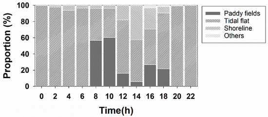 The proportion of the total time spent in specific habitats suggested that Swan Goose individuals spent the greatest proportion of time on tidal flats (74.4%) and less time in paddy fields (15.6%), shorelines (9.6%) and others (0.4%) (Figure 3). The relative proportions of time spent in the four habitats differed between day and night. During the daytime (08:00–18:00), Swan Geese mostly spent time on tidal flats (especially around tidal channels), coastal, and agricultural areas. At night, they mostly stayed in tidal flats, including sand dunes near Yubu Island. GPS tracking information was recorded around sand dunes northeast of Yubu Island and around tidal channels far from the shorelines in Janggu Bay. The proportion of time spent in paddy fields increased in the early morning (56.8%–60.2%; 08:00–10:00) and late afternoon (21.8%–26.7%; 16:00–18:00).
