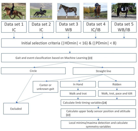 Schematic representation of the data-processing procedure applied for the different data sets. IC: Icelandic horse, WB: Warmblood horse, IB: Iberian horse. HDmin: difference in minimum position of the head between left and right diagonals at trot. PDmin: difference in minimum position of the pelvis between left and right diagonals at trot.