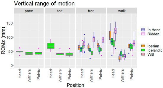 Results are presented as descriptive statistics. To test the effect of breed (Icelandic vs. Warmblood vs. Iberian) and anatomical location (head, withers and pelvis) on the target variables, linear mixed models were built in R-Studio (version 1.3, Boston, MA, USA). Three models were built: (1) to test the effect of breed and anatomical location on upper body ROMz using horse ID as random effect and the interaction between breed and anatomical location as fixed effect; (2) to test the effect of breed on timing of minima and maxima of head, withers and pelvis positions in relation to stance phase, using breed as fixed effect and horse ID as random effect; and (3) to test the effect of breed on limb kinematic parameters (suspension time, stride duration, diagonal dissociation) using horse ID as random effect and breed as fixed effect. Model results (for ROMz, see Figure 2) are presented as estimated marginal means (EMM) and lower/upper confidence intervals (CI) using the package “emmeans” (version 1.4.5, Boston, MA, USA). Significance was set at p < 0.05, and p values were adjusted for multiple comparison using the Tukey method. Model adequacy (normality and constancy of variance) was confirmed using visualisation of the scatter plot residuals vs. fitted values and explanatory variables, respectively, and QQ-plots. The remaining discrete variables are presented as median and interquartile range (IQR).