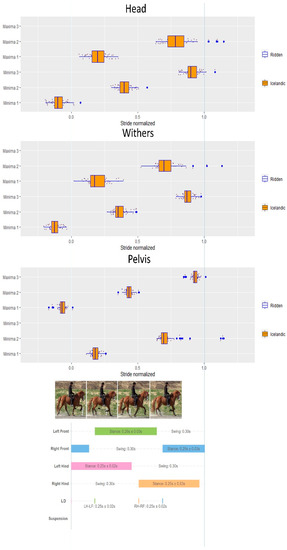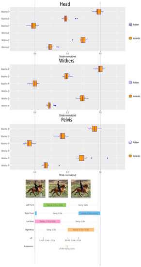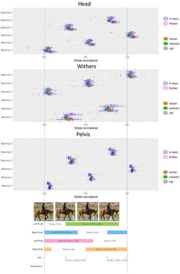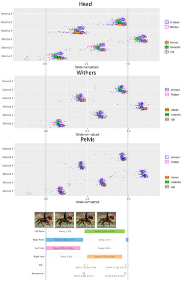 Descriptive results of the timing of the minima and maxima of the axial body segments (head, withers, pelvis) in relation to the footfall patterns during trot for all horses within the three breeds are presented in Figure 4.
