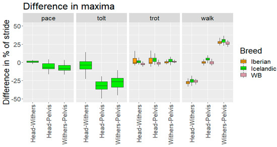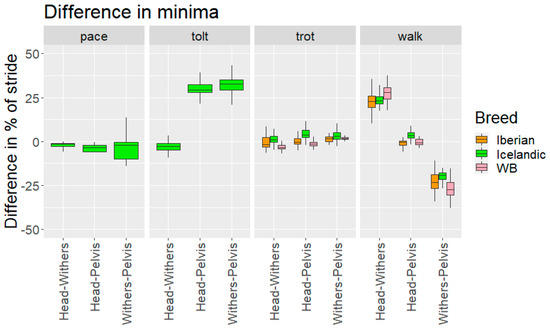 Differences in relative timing of minima and maxima between the different body segments (head–withers, head–pelvis and withers–pelvis) in the three breeds when performing different gaits are presented in Table 5 and Figure 7 and Figure 8.