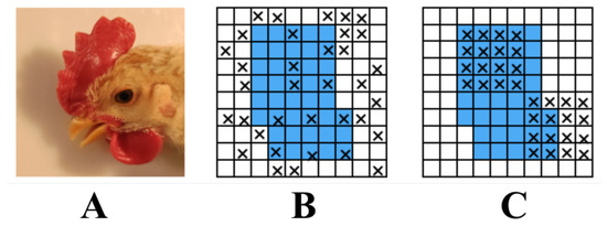 The effect of DropBlock regularization. (A) is the original image and the blue parts in (B,C) represent the activation units containing semantic information, which cannot be removed. The black cross parts are marginal features of chicken faces.