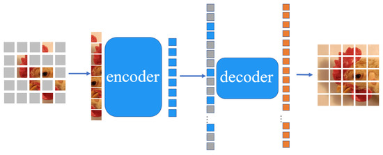 MAE is an asymmetric encoder–decoder structure, where the encoder only operates on unmasked patches, while the decoder is responsible for reconstructing the image from the hidden space in combination with a mask token, as shown in Figure 4.
