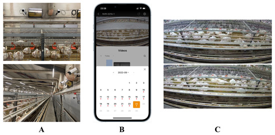 Intelligent system of chicken coop based on the model of this paper. (A): HD camera in the chicken coop; (B): app for accessing video stream; (C): video stream display.