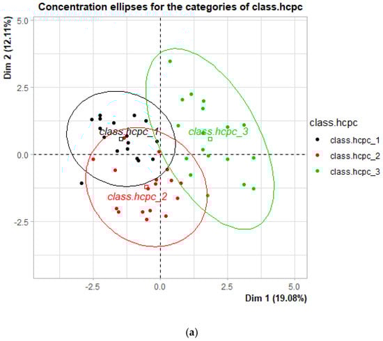 The MFA reduces the number of initial variables into fewer and better interpretable features (dimension), and the first five dimensions had eigenvalues > 1, explaining 59% of the variance. The eigenvalues of the MFA ranged from 1.2 to 2.7 (Table 3). The HCPC cluster split farms into three classes, which were relatively similar to their region. Most of the farms in Kocaeli were clustered in cluster 1, farms in Balikesir were clustered in cluster 2, and those in Istanbul were clustered in cluster 3 (Figure 1).