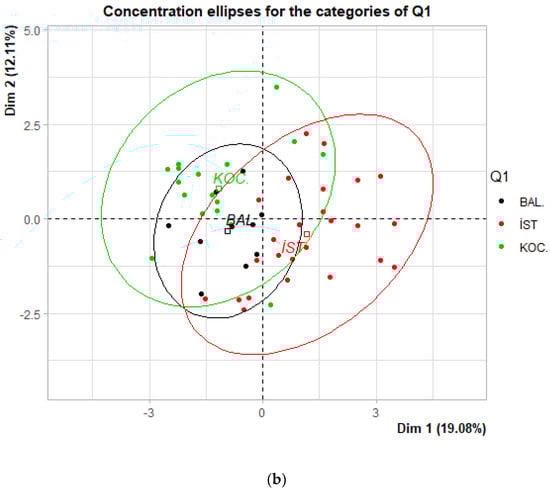 (a) The location of each cluster was revealed according to the hierarchical cluster analysis (class.hcpc). Dots represent the coordinates of each farm, squares represent the geometric centre of each cluster, circles indicate the 95% confidence interval, dim 1 and 2 are the first two dimensions obtained from the multiple factor analysis (MFA), and in brackets are reported the explained variances from each dim. (b) The location of each cluster was revealed from the region (Q1) where Koc. refers to Kocaeli, Bal. refers to Balikesir, Ist. refers to Istanbul, dots represent the coordinates of each farm, squares represent the geometric centre of each cluster, circles indicate the 95% confidence interval, dim 1 and 2 are the first two dimensions obtained from the multiple factor analysis (MFA), and in brackets are reported the explained variances from each dim.