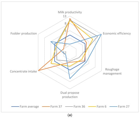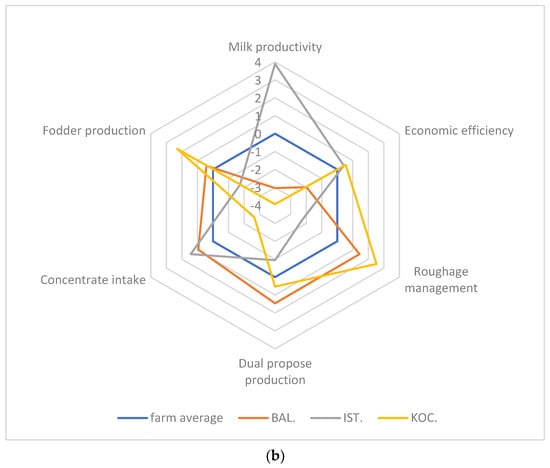 Lastly, our analysis enabled us to compare performances at farm level (Figure 2a) and territorial level (Figure 2b) in relation to the extracted factors in the spider charts. When comparing the performances of randomly chosen farms, farm 27 showed an interesting pattern in obtaining high economic efficiency scores. In this case, having a good roughage management, diversifying farm activities, and producing own feed could lead to improved economic efficiency scores. Similarly, in the case of territorial level, farms in Istanbul showed intensification characteristics compared to other regions, in which they obtained higher scores on milk productivity and concentrate intake, and low scores on fodder production. However, they need to improve their roughage management, farm activities, and feed production; this could improve their economic efficiency, as in the example of farms located in Kocaeli. Those farms had slightly better economic efficiency scores than farms in Istanbul, and they had the highest roughage management scores as well as fodder production scores. Atzori et al. [] reported the benefits of using spider charts, as they quantify the farms needing improvement in a specific area. Moreover, they are a solid tool for supporting short-term decision making when a complete balance sheet is not available. Spider charts provide recommendations for improving performance within specific areas by facilitating the comparison with other farms.