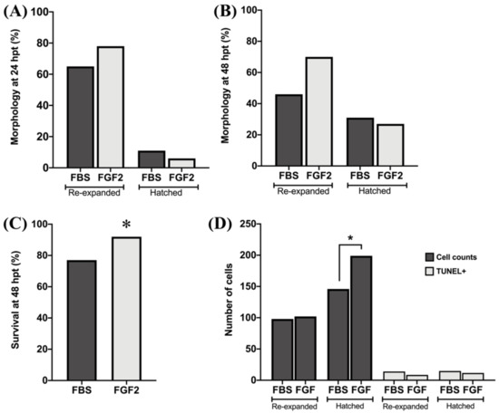 Effect of embryo culture system (defined vs. undefined) on the morphology, survival rate and cell count of vitrified embryos after warming. Embryos were analyzed at 24 h (A) and 48 h post thawing (B–D). FBS: fetal bovine serum; FGF2: fibroblast growth factor 2. Cell counts: total number of cells. TUNEL+: cells positives to the terminal deoxynucleotidyl transferase dUTP nick end labeling. * p < 0.05.