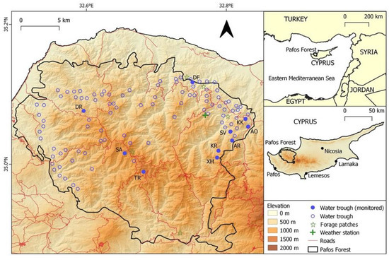 Map of the Pafos Forest area where the network of water thoughts was established for the watering of Cyprus mouflon. (DR: Dromonas; SA: Selladi Arnion; TR: Tripilos; DF: Den of Fox; SV: Selladi Voullas; KK: Kokinokremmos; AO: Apo Orkontas; AR: Artratsa; XM: Xeromoutas; KR: Koriftos).
