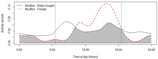 Mouflon activity overlap at monitored water troughs (n = 10) and forage sites (n = 5) (coefficient of overlap Δ = 0.64). Sunrise and sunset are marked at their average time for the study period (gray zone shows the overlap area).