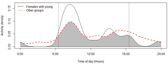 Activity overlap at the monitored water troughs of mouflon groups with females and young and other mouflon groups (coefficient of overlap Δ = 0.72). Sunrise and sunset are marked at their average time for the study period (gray zone shows the overlap area).