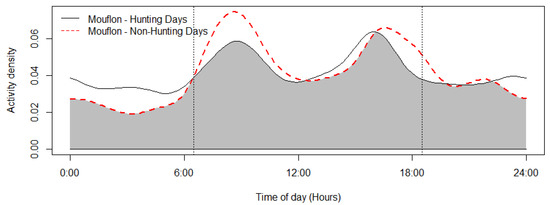 Mouflon activity overlap of days with and without hunting (coefficient of overlap Δ = 0.91). Sunrise and sunset are marked at their average time for the study period (gray zone shows the overlap area).