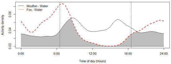 Mouflon and red fox activity overlap at the ten monitored water troughs (coefficient of overlap Δ = 0.6). Sunrise and sunset are marked at their average time for the study period (gray zone shows the overlap area).