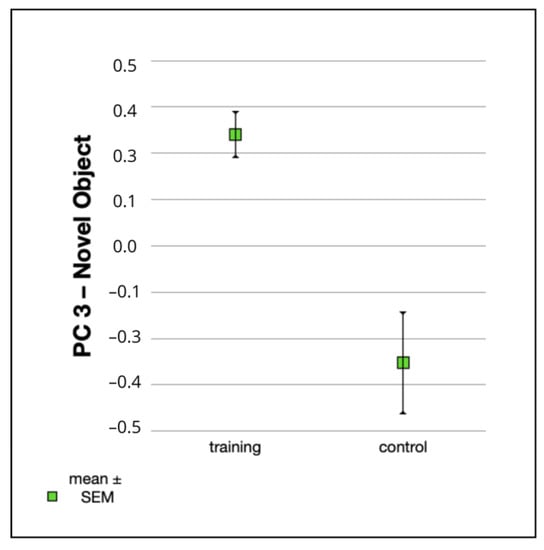 Mean values ± SEM for “PC 3—Novel Object” in the treatment group (n = 42) and the control group (n = 41).