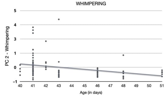 There were no significant effects of treatment on “PC 2—Whimpering” (F1,69 = 1.7, p = 0.1962; Table 10) and “PC 4—Exploration” (F1,69 = 0.04, p = 0.8511; Table 11). Whimpering tended to decrease with age (Figure 3; Table 10). No other demographic variables were significantly related to any of the components.