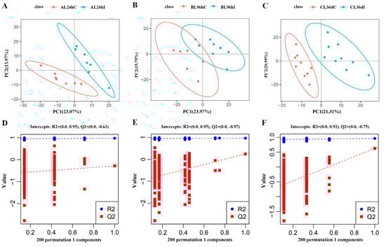 The partial least squares discriminant analysis (PLS-DA) model score map (A–C), and the response sequencing verification diagram of the PLS-DA model (D–F) between the infected group (I) and control group (C) at 24 hpi, 96 hpi, and 36 dpi, respectively.