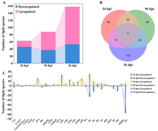 Overall, 63, 88, and 157 differential lipids were identified at 24 hpi, 96 hpi, and 36 dpi, respectively (Figure 3A, Supplementary Figure S5, and Table S4). At 24 hpi, 46 differential lipids were downregulated and 17 differential lipids were upregulated, which belong to 14 lipid subclasses, such as TG (18:2/18:2/18:2), lysophosphatidylcholine (22:5, LPC (22:5)), and DG (16:0/18:2). At 96 hpi, 37 differential lipids were downregulated and 51 differential lipids were upregulated, which belong to 18 lipid subclasses, such as TG (16:0/18:1/18:1), lysophosphatidylserine (20:0, LPS (20:0)), and PC (18:0/22:6). At 36 dpi, 53 differential lipids were downregulated and 105 differential lipids were upregulated, which belong to 27 lipid subclasses, such as TG (16:0/16:0/16:1), lysophosphatidylglycerol (22:5, LPG (22:5)), and phosphatidylserine (20:2/20:2, PS (20:2/20:2)). Furthermore, two differential lipids were commonly identified between the three infection stages, namely TG (16:1/18:1/18:2) and TG (16:0/18:1/19:0) (Figure 3B). The Venn diagrams show that 22 common differential lipid species were identified at 24 hpi and 96 hpi, and all differential lipids were downregulated in these two infection stages; 24 common differential lipid species were identified at 96 hpi and 36 dpi, with two downregulated differential lipids and 22 upregulated differential lipids in these two infection stages.