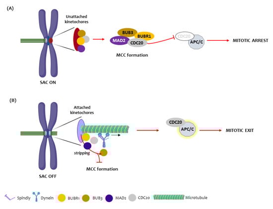 The Spindle assembly checkpoint mechanism. (A) In the presence of unattached or misattached kinetochores (red circle), the spindle assembly checkpoint is turned on (SAC ON) and the kinetochore proteins BUB3, BUBR1, MAD2 and CDC20 assemble at the cytosol to form the mitotic checkpoint complex (MCC). Once the MCC is generated, the CDC20 becomes unable to bind to the anaphase-promoting complex/cyclosome (APC/C), leading to mitotic arrest at the metaphase to anaphase transition. (B) Upon appropriate kinetochore microtubule attachments, the SAC is turned off (SAC OFF) through dynein/SPINDLY-mediated stripping of BUB3, BUBR1, MAD2 and CDC20 from attached kinetochores, which prevents the assembly of new MCC and through disassembly of existing MCC (not shown). Both mechanisms release CDC20 which, thus, binds to and activates the APC/C, promoting mitosis exit.