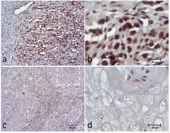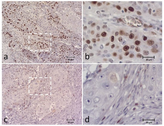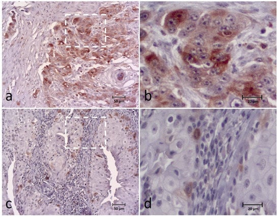 Immunohistochemical (IHC) staining of the Ki-67 in canine OSCC (a–d) showing high expression (a,b) and low expression (c,d) of the biomarker. Figures (b,d) correspond to a higher magnification of the white square indicated in cases (a,c), respectively.