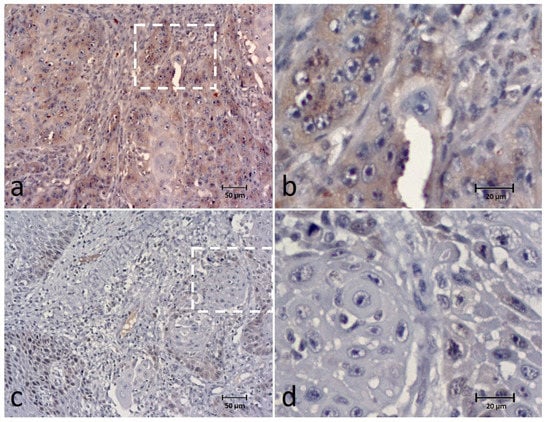 Immunohistochemical (IHC) staining of the BUB3 in canine OSCC (a–d) showing high expression (extent and intensity) (a,b) and low expression (extent and intensity) (c,d) of the biomarker. Figures (b,d) correspond to a higher magnification of the white square indicated in cases (a,c), respectively.