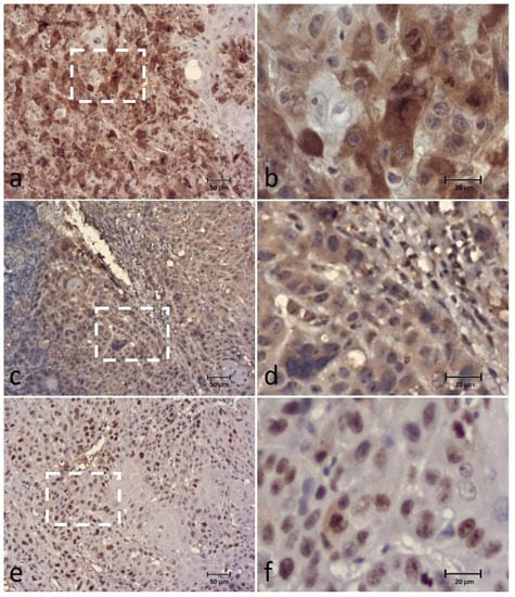Immunohistochemical (IHC) staining of the BUBR1 (a,b), SPINDLY (c,d) and Ki-67 (e,f) in the same case of canine OSCC, showing high expression of all biomarkers. Figures (b,d,f) correspond to a higher magnification of the white square indicated in cases (a,c,e), respectively.