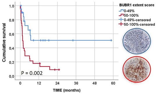 During Kaplan–Meier (and log-rank test) analysis, histological type (p = 0.013), pattern of invasion (p = 0.011), stage of invasion (p = 0.009), type of treatment (p = 0.048), tumor stage (p = 0.001) and BUBR1 extent (p = 0.002) were statistically associated with CSS, as can be observed in Tables S6 and Table 3, and also Figure 7.
